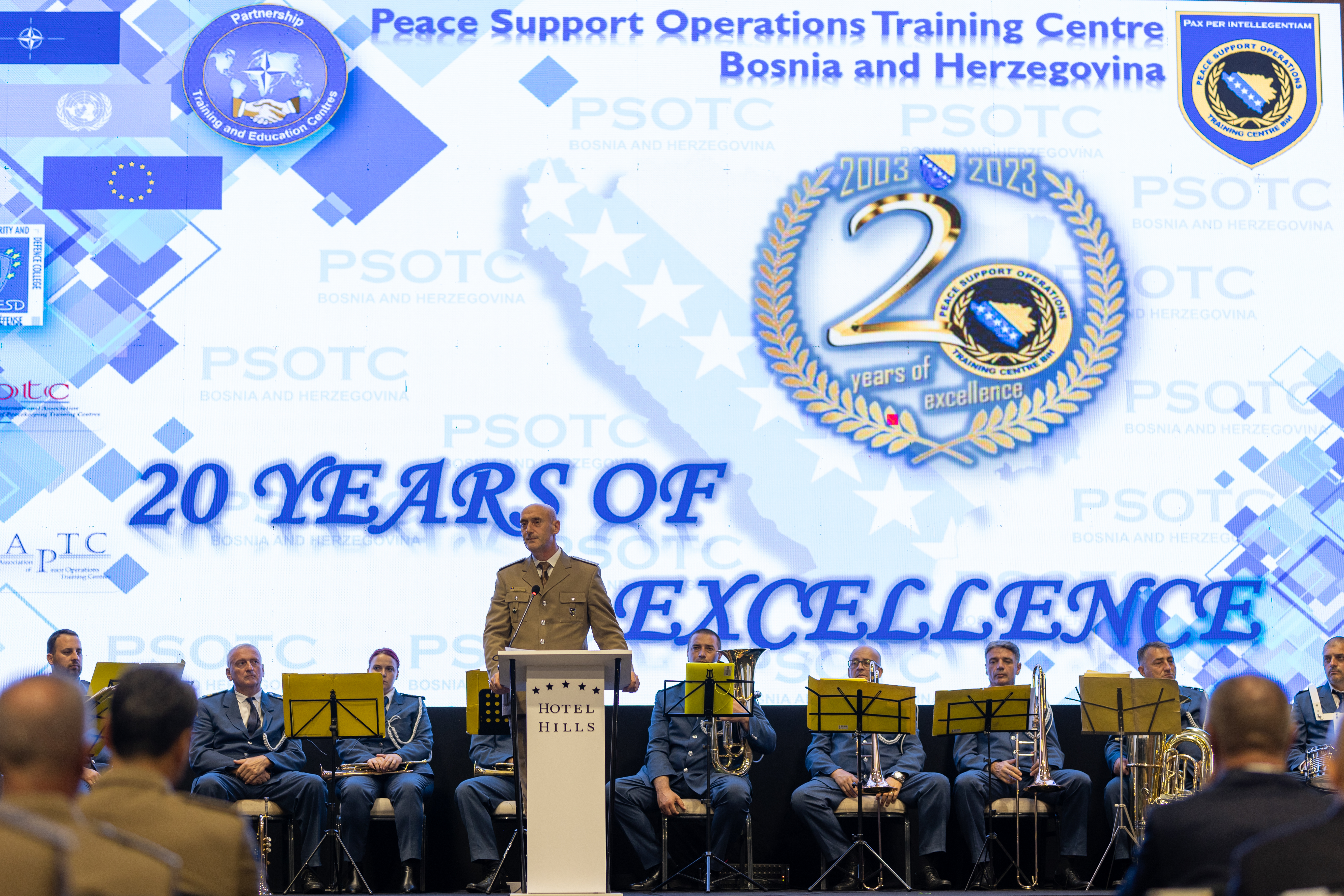On Monday, September 18, 2023, the Bosnia and Herzegovina Ministry of Defense, the Peace Support Operations Training Centre (PSOTC), and the Embassy of the United Kingdom of Great Britain and Northern Ireland organized a formal academy at the Hills Hotel on the occasion of the 20th anniversary of PSOTC.