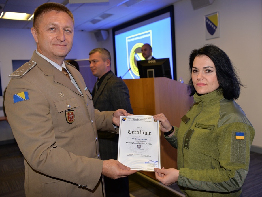 The Building Integrity in Peace Support Operations Course (BIPSOC), a NATO approved course, was conducted from 22nd to 26th October 2018 with participation of 30 students from 13 different countries as follows: 11 students from Bosnia and Herzegovina, and 19 international ones from Azerbaijan, Egypt, Germany, Georgia, Hungary, Italy, Jordan, Macedonia, Moldova, Tunisia, Ukraine, and the United Kingdom. BIPSOC is delivered in support of NATO HQ Brussels and NATO ACT Norfolk, and with relevant lecturers and instructors from NATO HQ Brussels, NATO HQ Sarajevo, The United Nations Office on Drugs and Crime, Transparency International BIH, BIH Agency for the Prevention of Corruption and Coordination of the Fight against Corruption, SIPA and PSOTC. The aim of the Course was to educate and train selected military officers and police personnel practices and processes and deliver a skill set that enables them to understand and counter the various types of corruption that undermines mission success in multinational PSO, and it is achieved successfully. By addressing to the graduates at the closing ceremony of the Course, Colonel Edin Bajramović, PSOTC Commandant, emphasized importance of attending the BIPSOC, and thanked to all who contributed in successful completion of the Course.