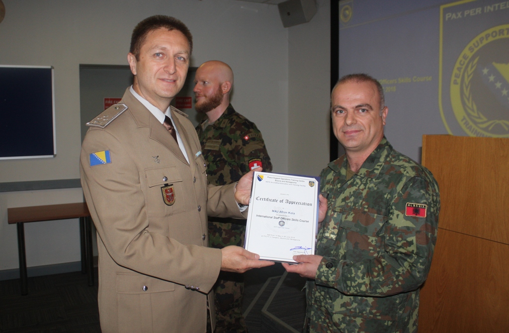 ISOSC is a NATO accredited four week long course. 14 students, 10 from Bosnia and Herzegovina, and 4 international students (Albania, Macedonia, Azerbaijan, and Tunisia) were attending the course and received their certificates at the graduation ceremony held at PSOTC on 8th June 2018. Besides PSOTC staff, guest lecturers from the NATO and EUFOR Headquarters, Sarajevo, OSCE mission to BiH, Center for Security Studies Sarajevo, BiH Parliament and SWISSINT gave a huge contribution to the quality of the course. During the course, the participants developed their essential staff skills in accordance with NATO standards and as a result they were prepared for their engagement in international and national headquarters in Peace Support Operations.